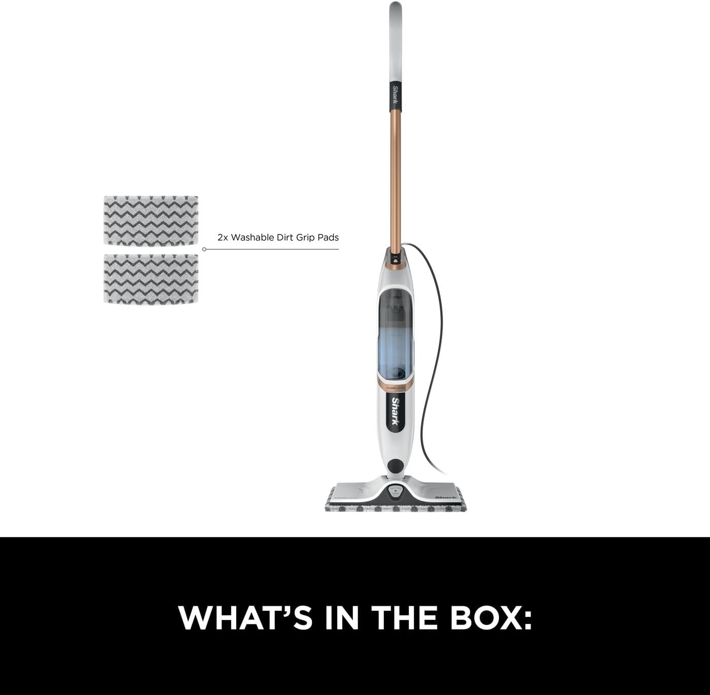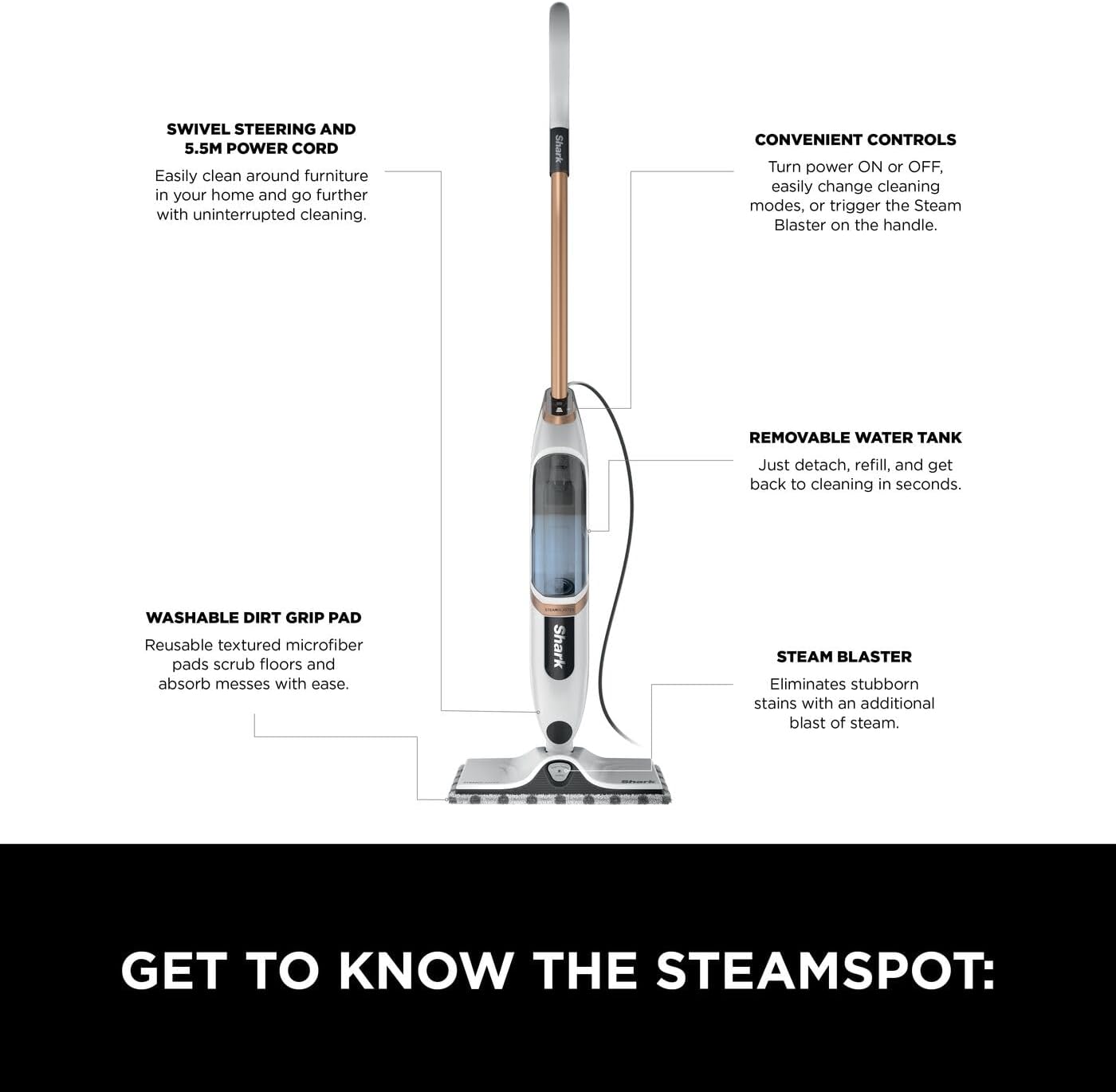 Shark SteamSpot with Steam Blaster Technology for Hard Floors, Lightweight steam mop Chemical-Free Cleaning, Removable water tank, Inc. 2x machine-washable Dirt Grip pads, White & Poly Copper S2001UK